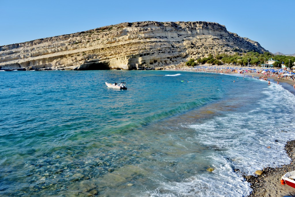Potrete così apprezzare il romanticismo di Matala e ammirare la splendida mezzaluna di sabbia circondata dalle leggendarie grotte all’ombra di uno degli accoglienti bar sul mare (preferite quelli verso il porto, da lì il panorama verso l’insenatura è migliore).