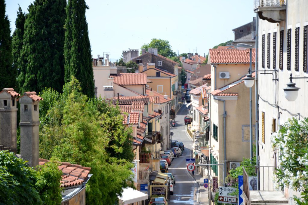 IL PAESE. Abbarbicato sul colle, Moscenice è un piccolo borgo perfettamente ristrutturato. Il fatto che la statale lo separi dalla località sul mare, rende il villaggio ancora più tranquillo, perché molti turisti non arrivano nemmeno fino a qui ed evitano di imboccare la strada in salita di fronte a Brsec/Bersezio, preferendo rimanere sulla carreggiata principale che conduce fino al mare. Al nucleo storico si accede dalla porta cittadina (sotto il cui arco si trova l’entrata al museo cittadino). Gli stemmi con l’aquila bicipite asburgica si notano sia sulla porta di entrata sia sulla facciata di una casa subito dopo aver varcato l’ingresso al nucleo storico. L’intero paese si percorre in pochi minuti, in un saliscendi di vicoli, volte e scale, con lo sguardo rivolto ai balconi e alle porte abbellite da vasi di fiori colorati. E infine, la vista sul mare e sull’elegante insenatura di Mošćenička Draga.
