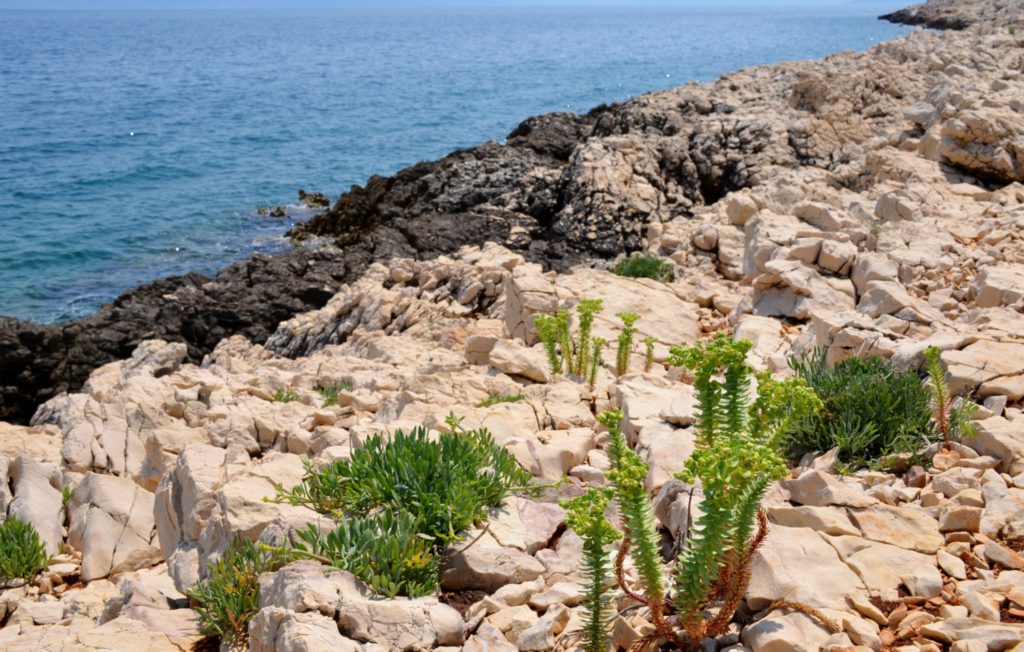 Ad un certo punto la strada da asfaltata diventa un ampio sentiero in terra battuta su cui si percorre l’ultimo tratto di costa, che diventa sempre più rocciosa. Se non volete rassegnarvi a trovare uno spazio libero nella parte più affollata, avete un’unica alternativa, ma dovrete camminare un paio di chilometri. Di certo però ne varrà la pena. Passo dopo passo ci si allontana dalla riva costellata di ombrelloni e di residence per immergersi in una pineta. Dopo le spiaggette riservate ai bagnanti con cani e ai nudisti, spunta un tratto di costa caratterizzato da appuntite rocce bianche.