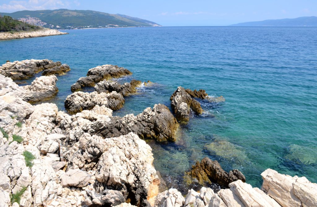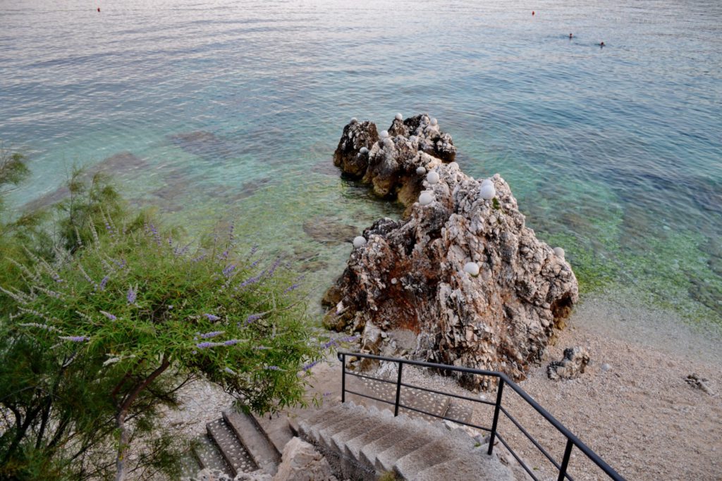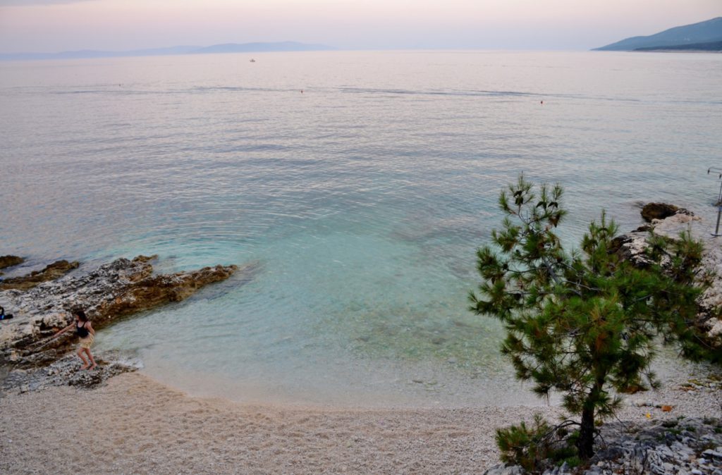 Proseguendo ancora, il sentiero termina in un’insenatura. Una scalinata di pietra scende ripida fino a una deliziosa spiaggetta di ghiaia. Da qualche anno è attrezzata con lettini e ombrelloni e c’è il piccolo beach bar Four Elements che serve qualche semplice bibita, come caffè freddo, acqua, coca cola e birra, mentre il pranzo dovete portarvelo al sacco, anche se potrebbe arrivare il venditore ambulante di ciambelle. Lo spazio di spiaggia libero è esiguo. Un ombrellone con due lettini costa 90 kune (12 euro). L’acqua è straordinaria, come su tutto il resto della costa di Rabat. È l’ultimo paradiso di Rabac, ancora lontano dalla folla.