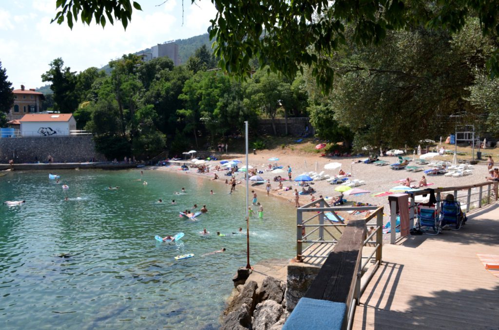 Con una breve passeggiata si raggiunge la spiaggetta di piccoli ciottoli, tanto amata dalle famiglie. Qui si possono noleggiare ombrelloni e lettini, oppure accamparsi liberamente. L’unico neo è che la spiaggia è a ridosso della statale, caratteristica di tutte le piccole baie da Lovran ad Abbazia. Bisogna infatti tenere presente che queste località, così apprezzate durante l’Ottocento e ai primi del Novecento, non prevedevano le distese di sabbia o di scogli attrezzati a cui siamo abituati noi.