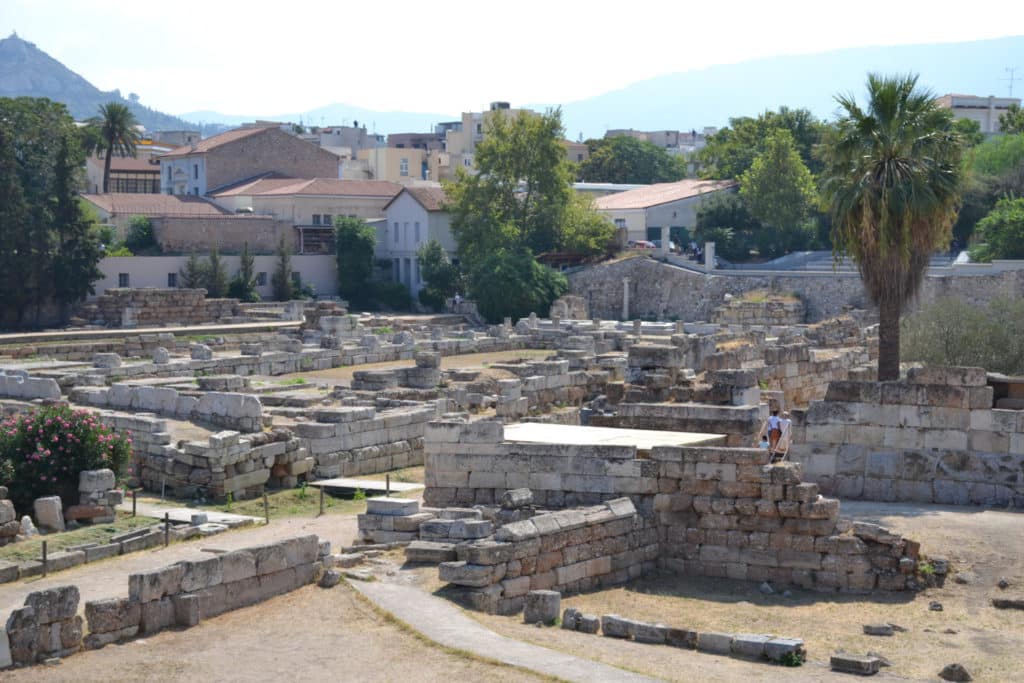 Dalla collina dell’Areopago. Da qui si può ammirare dall’alto l’agorà nella sua interezza e la vista arriva fino all’Acropoli.