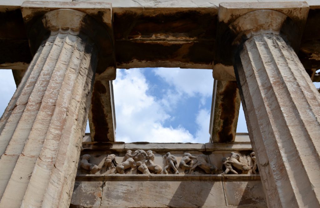 In fondo, seminascosto dagli alberi, si innalza il Tempio di Efesto, il tempio classico meglio conservato dell’intera Grecia, dedicato ad Efesto e ad Atena: dalla sommità della collinetta su sui si erge il tempio, si può ammirare l’agorà nella sua interezza. Il fregio raffigura le imprese di Teseo e Atena.