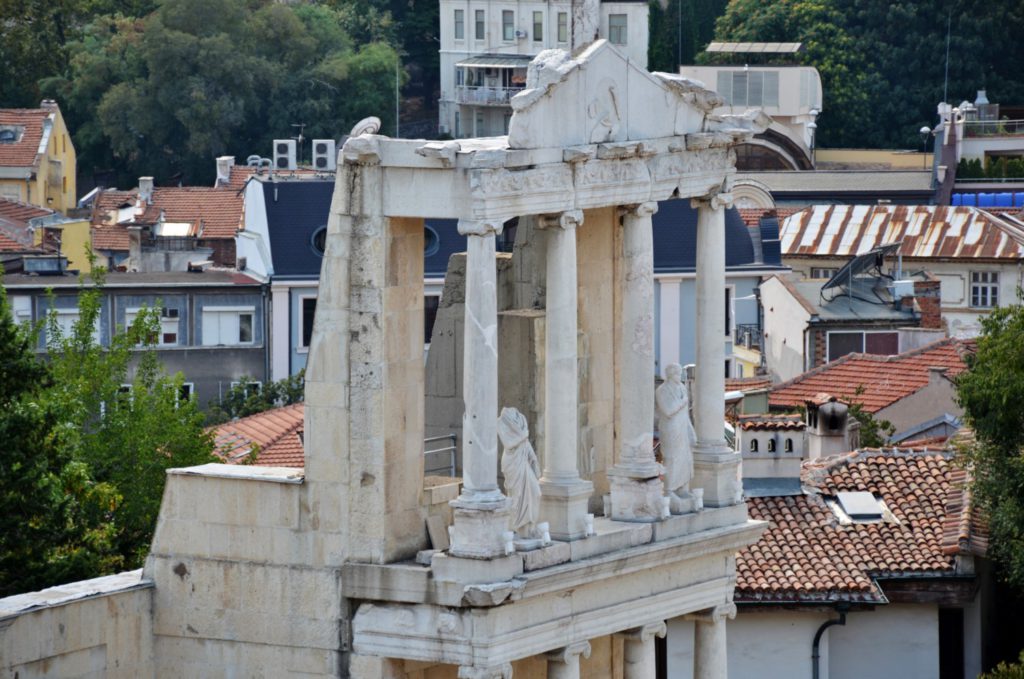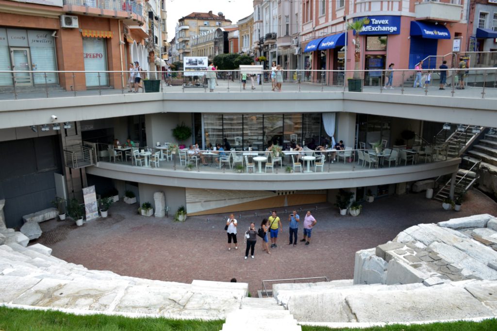Proseguendo lungo ulitsa Saborna, la via principale del centro storico, si incontra una serie di gallerie d’arte e un’antica farmacia. Dopo pochi metri si arriva al Teatro romano, il monumento più importante della città e principale testimonianza della presenza romana. Eretto tra il 114 e il 117 da Traiano, è formato da 14 gradinate in grado di ospitare fino a 7mila spettatori. Dopo aver fatto il giro dell’anfiteatro per poterlo ammirare da tutte le prospettive, si può imboccare un vicolo alle sue spalle, passando accanto all’anonimo edificio dell’accademia d’arte. Scendendo alcuni gradini si arriva in ulitsa Samodumov, proprio di fronte alla chiesa di Svet Dimitar, interessante per la sua rara iconostasi in marmo bianco, estratto dai monti Rodopi.