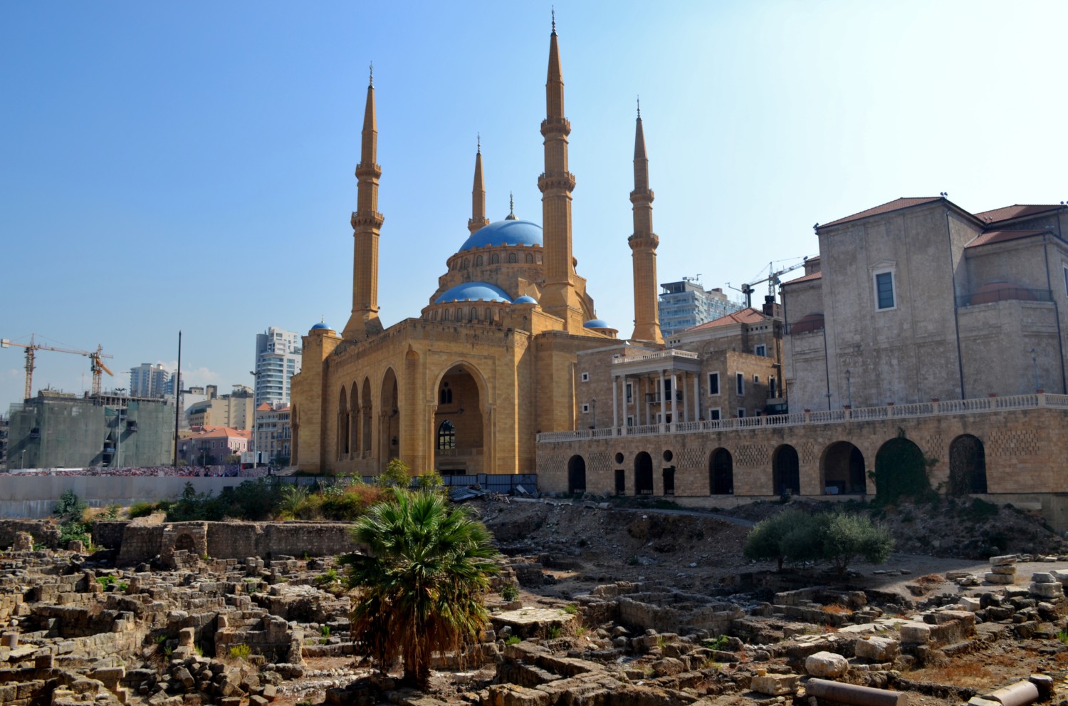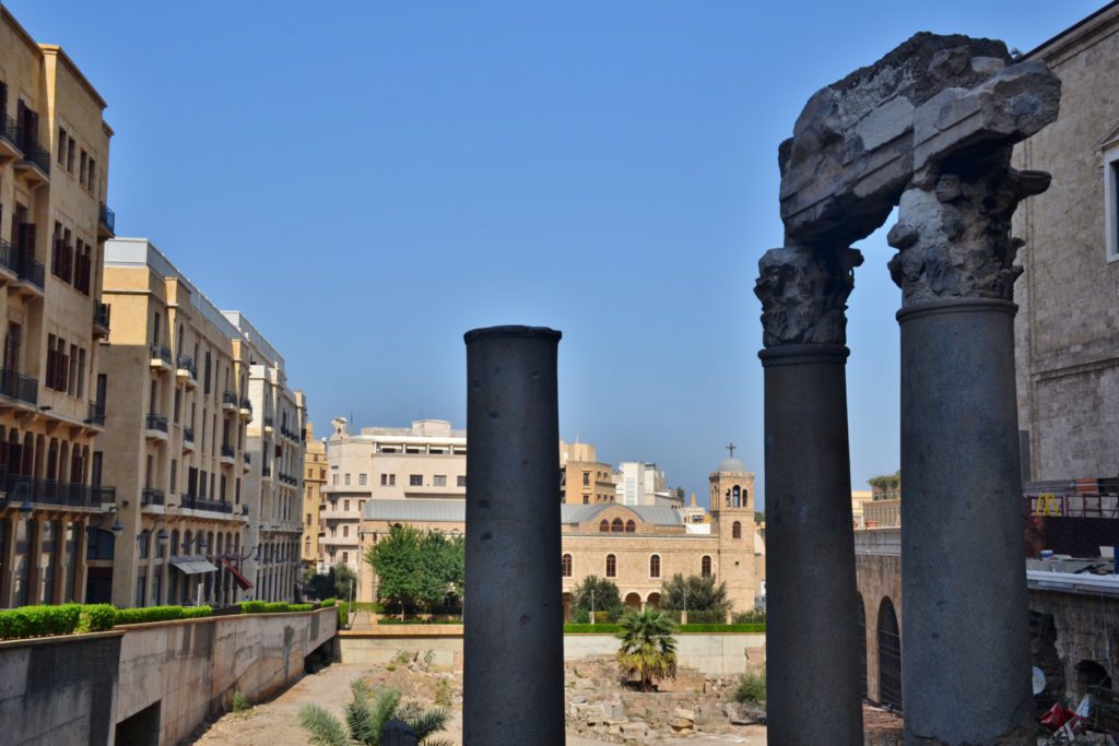 Ma la cosa che più colpisce è che l’area è chiusa al traffico, semideserta e militarizzata: gli accessi avvengono a piedi solo da alcuni varchi sorvegliati da militari armati che controllano i vostri movimenti e soprattutto quello che fotografate. Alcuni sono amichevoli, sorridono e salutano, altri sono più severi. In questa zona si concentrano tre moschee e tre chiese cristiane (ortodossa, cattolica e maronita) e molti ritrovamenti archeologici di epoca romana. La zona archeologica più vasta si trova alle spalle della grande moschea: qui è conservato una parte di un colonnato di una basilica romana.