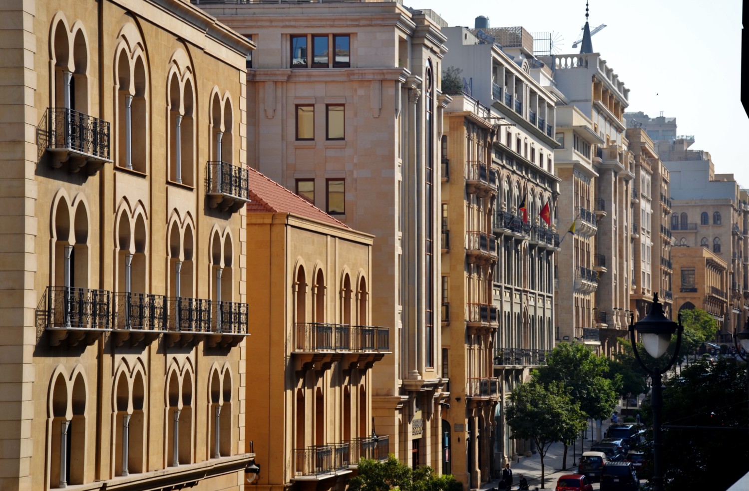 La prima parte è il centro storico che si sviluppa intorno a Nejme Square o Place d’Etoile con al centro la Torre con l’orologio Rolex, icona della città. Costruita dai Francesi, fu danneggiata durante la Guerra civile e ora ricostruita. Sulla piazza si affaccia il Parlamento, un caffè con tavoli all’aperto frequentato solo da qualche sparuto turista e la cattedrale ortodossa di San Giorgio. Tutte le costruzioni sono allineate in modo simmetrico intorno all’area radiale della piazza e alle strade su cui si affacciano i palazzi con i portici dalle grandi arcate. Il colore dominante delle costruzioni è l’ocra.