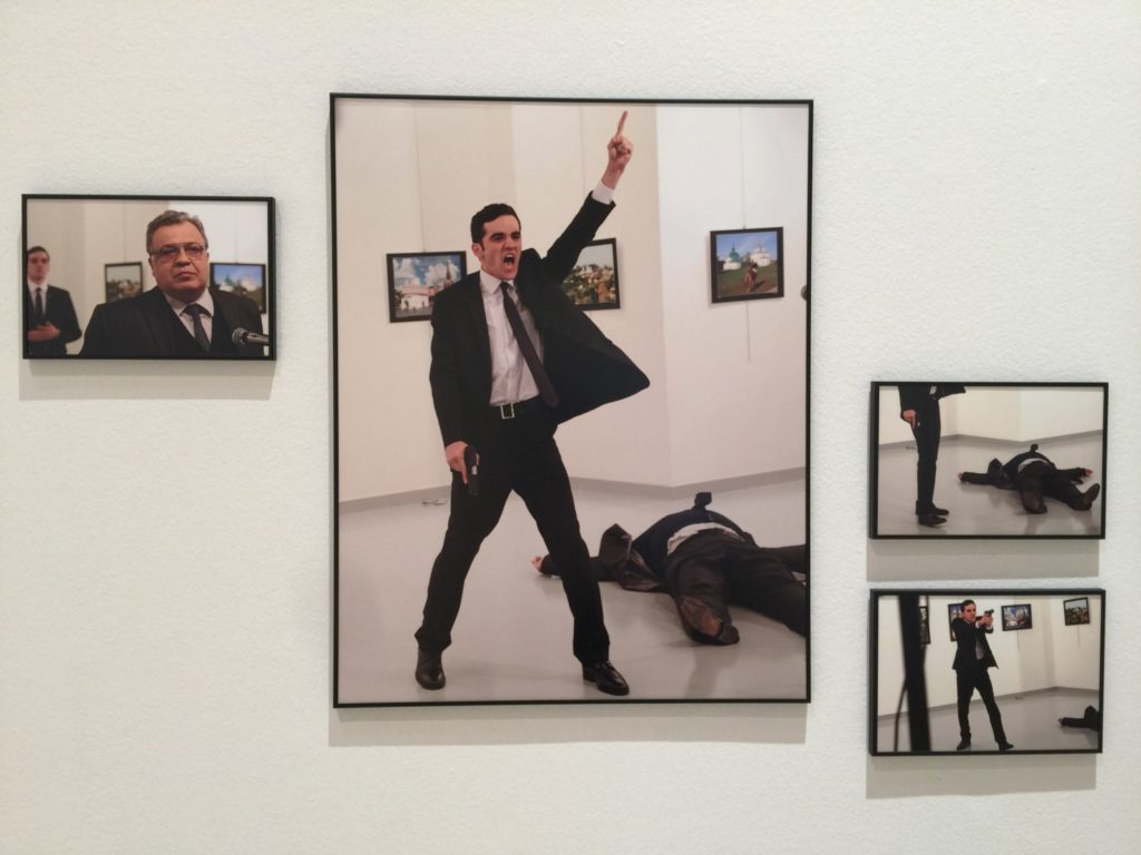 Le sei foto rappresentano la sequenza dell’omicidio dell’ambasciatore russo Andrey Karlov da parte di un poliziotto turco fuori servizio, Mevlut Mert Altintas, durante l’inaugurazione di una mostra in una galleria d’arte ad Ankara, lo scorso 19 dicembre. La foto centrale, quella che è stata decretata la foto dell’anno, ritrae l’assassino subito dopo aver colpito a morte l’ambasciatore, che giace al suo fianco a terra, mentre grida con il braccio alzato e la pistola in pugno “Allah è grande. Non dimenticate Aleppo. Non dimenticate la Sira”. Le altre foto mostrano l’ambasciatore ancora vivo con alle spalle l’inquietante ombra dell’omicida e i momenti subito dopo l’uccisione, compresi quelli con il pubblico impaurito ammassato in un angolo. Questa foto ha fatto il giro del web in poche ore subito dopo il tragico evento, diventando in breve tempo un’icona. L’assassino sarà ucciso subito dopo dalla polizia che ha fatto irruzione nella galleria.