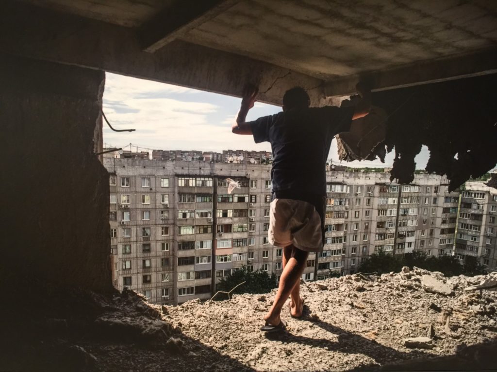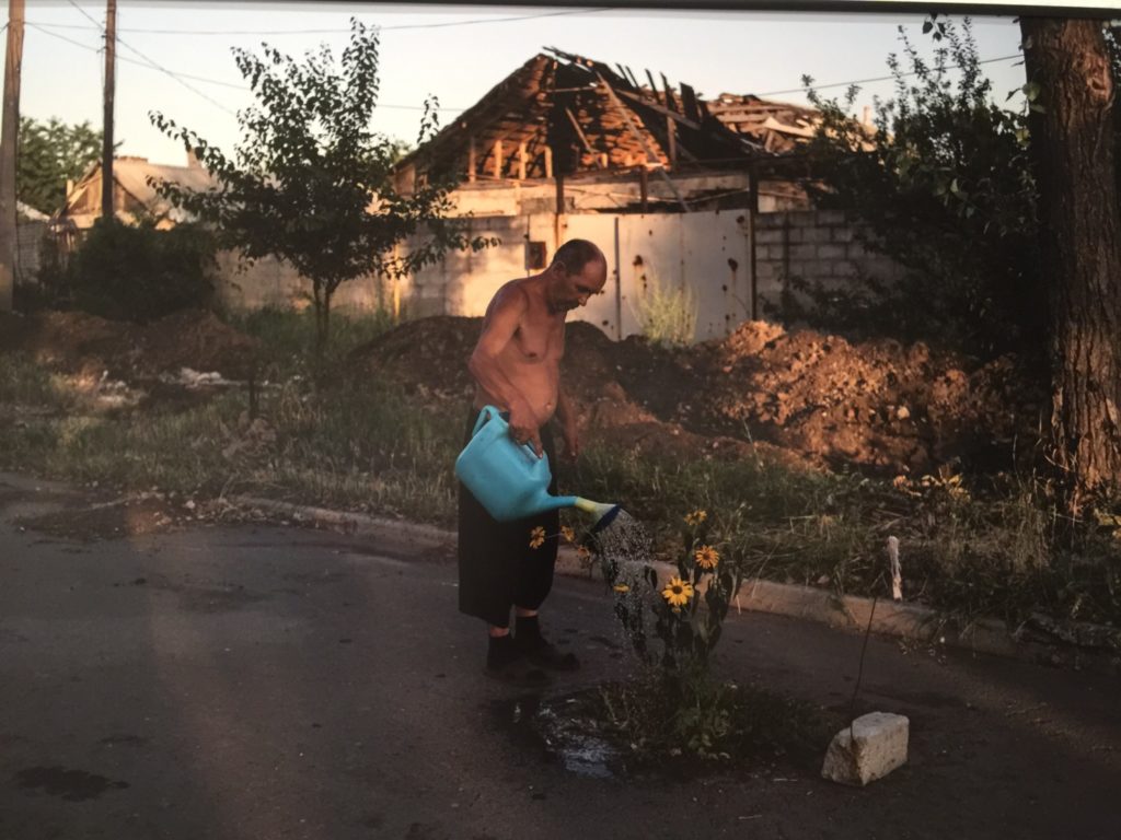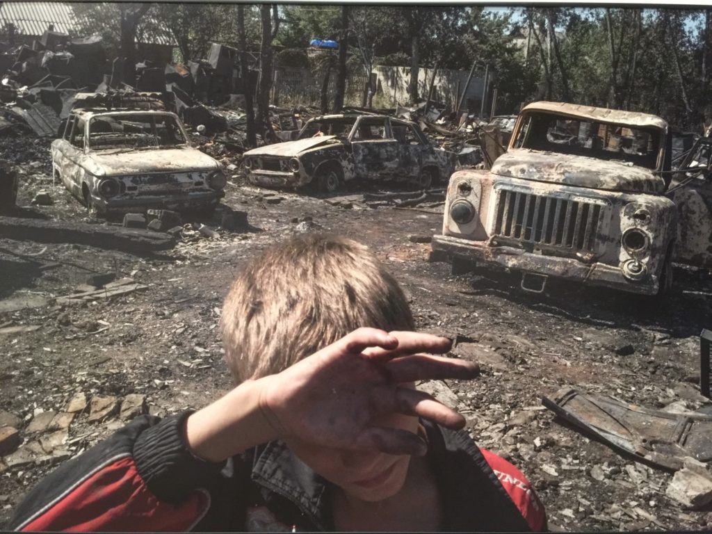 La guerra è scoppiata nell’estremità orientale dell’Ucraina, nelle regioni di Donetsk e Lugansk, nell’aprile del 2014, quando i separatisti pro-russi hanno preso il controllo dell’area e il governo ucraino ha lanciato un’offensiva militare. Nei mesi successivi la situazione è peggiorata, anche perché la Russia ha fornito armi e sostegno ai ribelli. Chi ha subito le conseguenze di tutto questo? Ovviamente la popolazione civile di cui il fotografo è andato a immortalare le condizioni di vita dopo lo scoppio del conflitto. I civili sono costretti a sopravvivere in una situazione sempre più precaria, costretti ad assistere impotenti ala distruzione delle proprie case e delle proprie città senza poter fare nulla. Alcune immagini sono estremamente poetiche, come quella di un anziano che annaffia un fiore cresciuto nell’asfalto, mentre alle spalle si vede una casa distrutta dai bombardamenti. Il primo piano di un bambino che alza un braccio per nascondersi il viso incorniciato da auto bruciate mostra come siano sempre i più deboli e indifesi a soffrire di più durante le guerre.